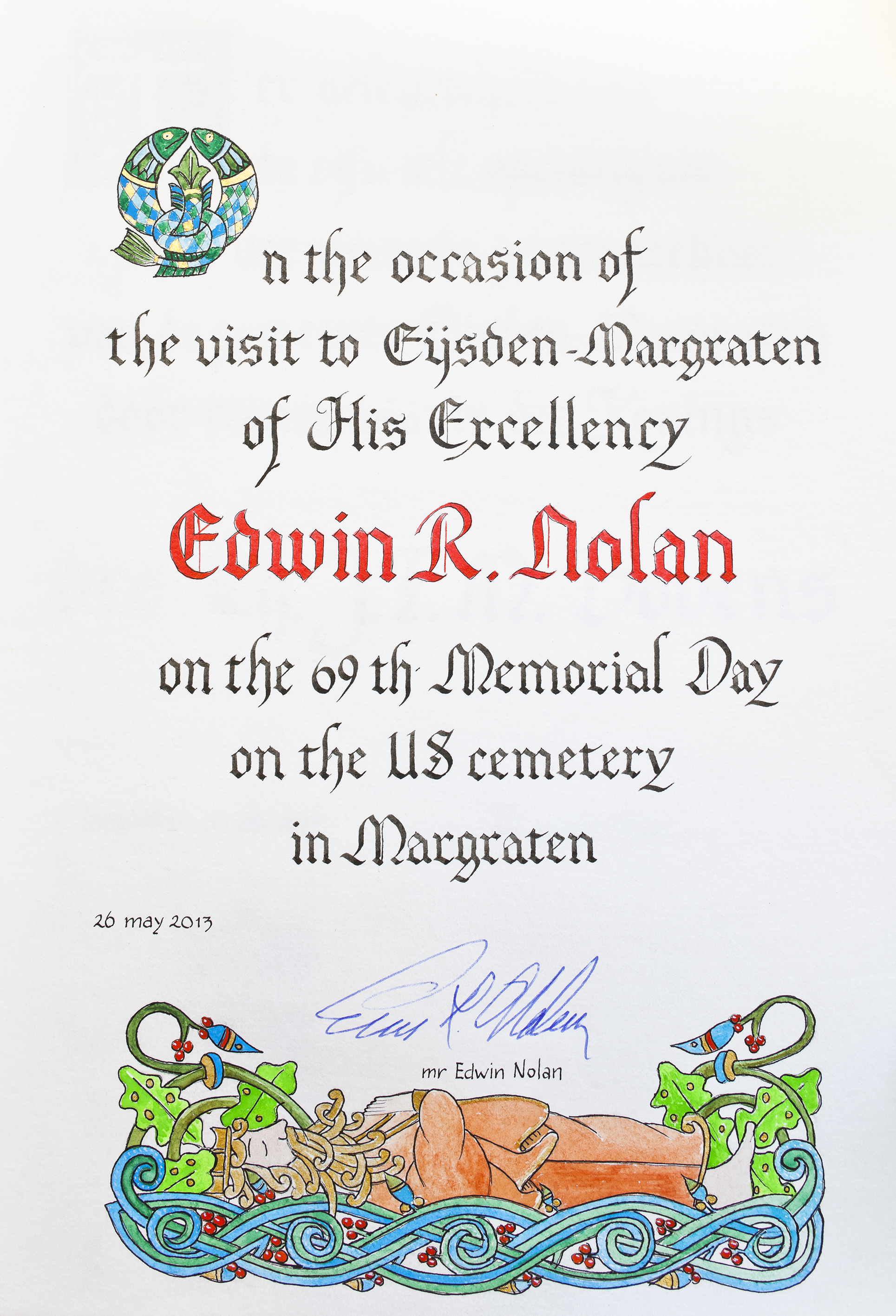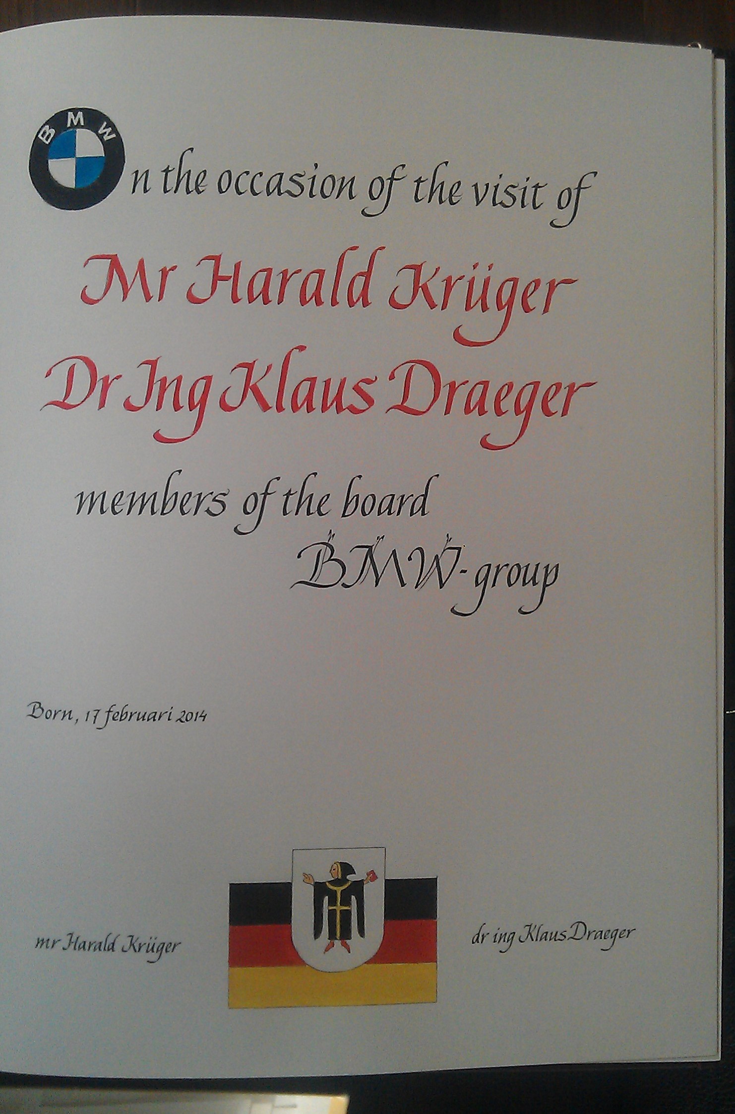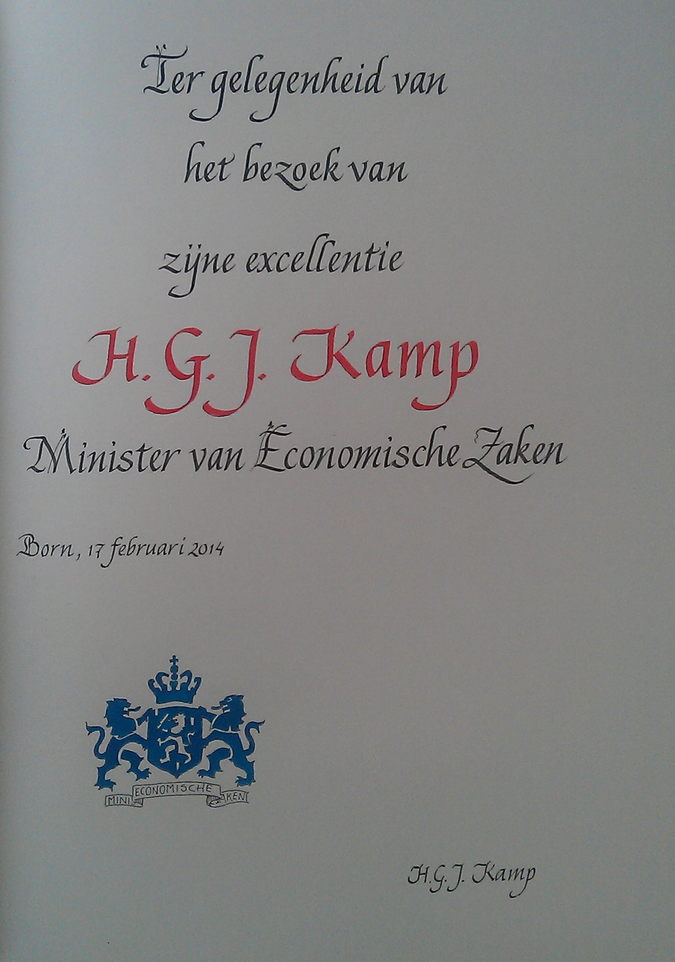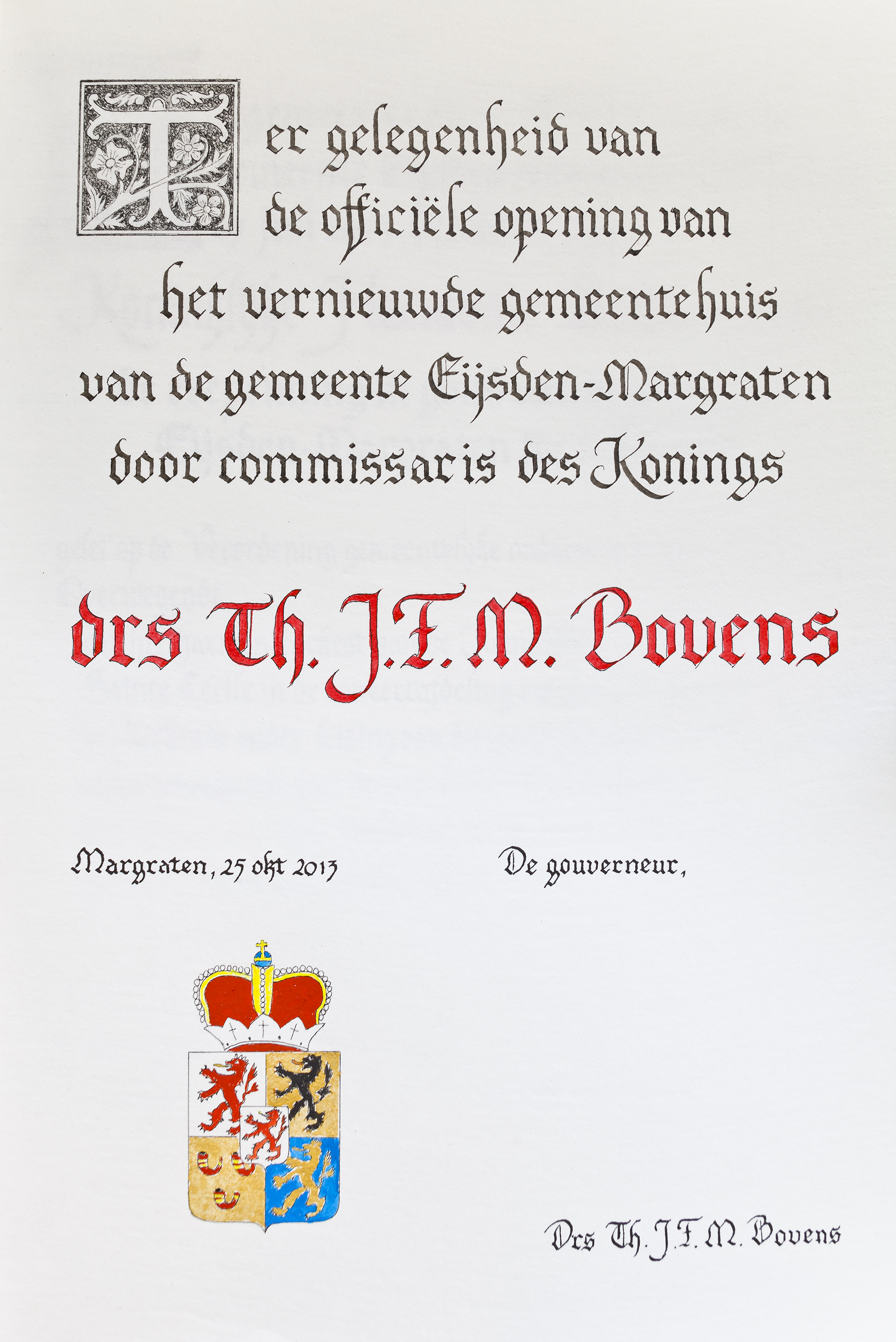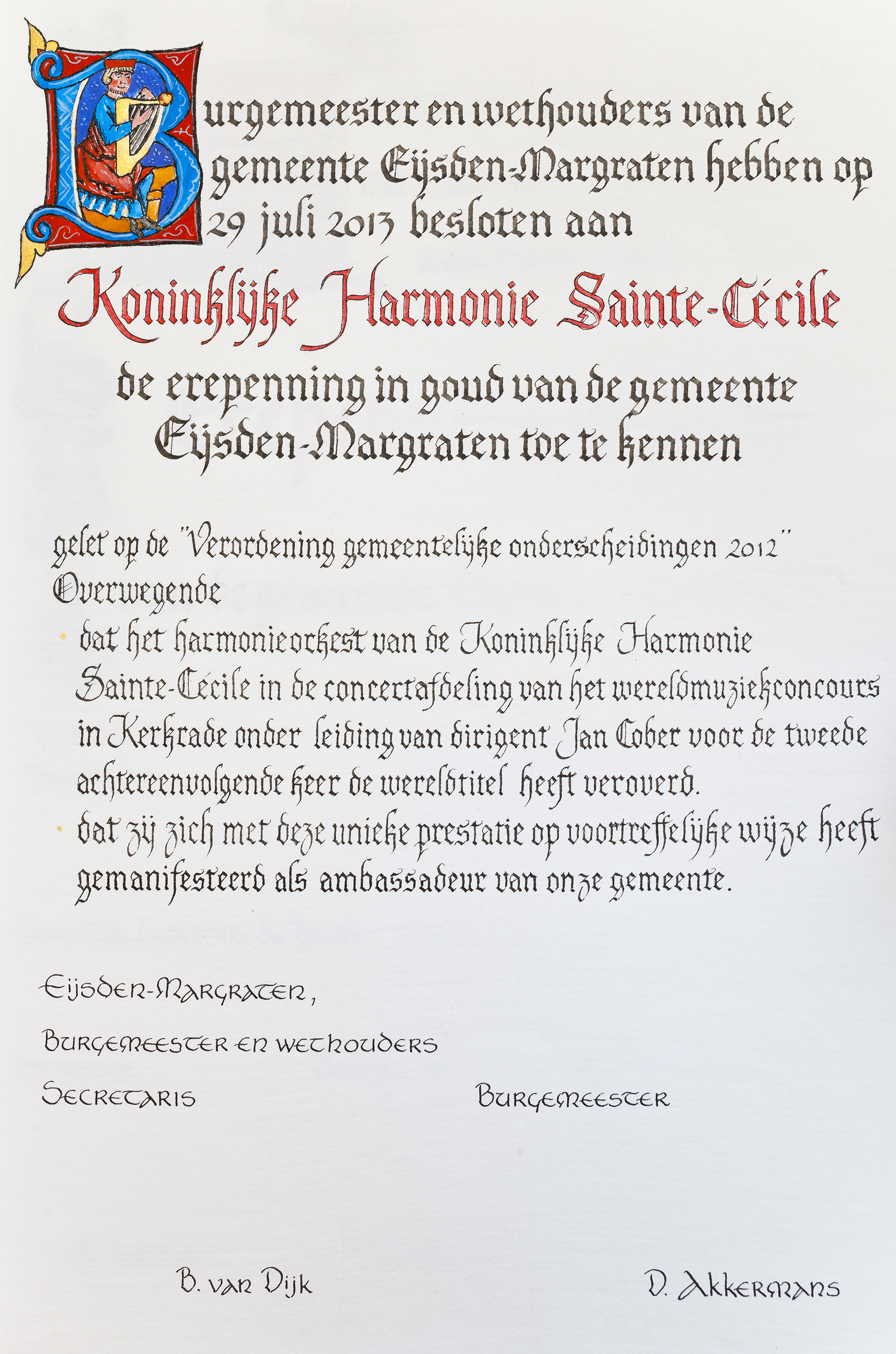 Voor de gemeente Eijsden-Margraten, de gemeente Kerkrade, Vaals, Simpelveld en NEDCAR in Born ben ik actief als huiskalligraaf. Tevens ben ik actief als kalligraaf voor het Wereld Muziek Concours in Kerkrade.